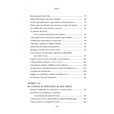 O presente Livro agora entregue ao leitor oferece-nos quatro Sermões de Santo Agostinho, ajustados à efeméride que a Igreja de Lamego celebra no ano em curso de 2026: o extenso e intenso Sermão 46 [Acerca dos Pastores segundo o Profeta Ezequiel 34,1-16], e os Sermões 336, 337 e 338, mais breves, proferidos pelo santo Bispo de Hipona na ocasião da Dedicação de uma igreja. No Sermão 46, Agostinho lê e comenta passo a passo, no seu estilo inconfundível, o referido texto de Ezequiel, repetindo uma e outra vez que o Pastor deve servir as ovelhas, e não servir-se delas, roubando-lhes a lã e o leite e, porventura, também a vida. Nos Sermões referentes à Dedicação de uma igreja, Agostinho salienta o trabalho da construção e a chama da dedicação.